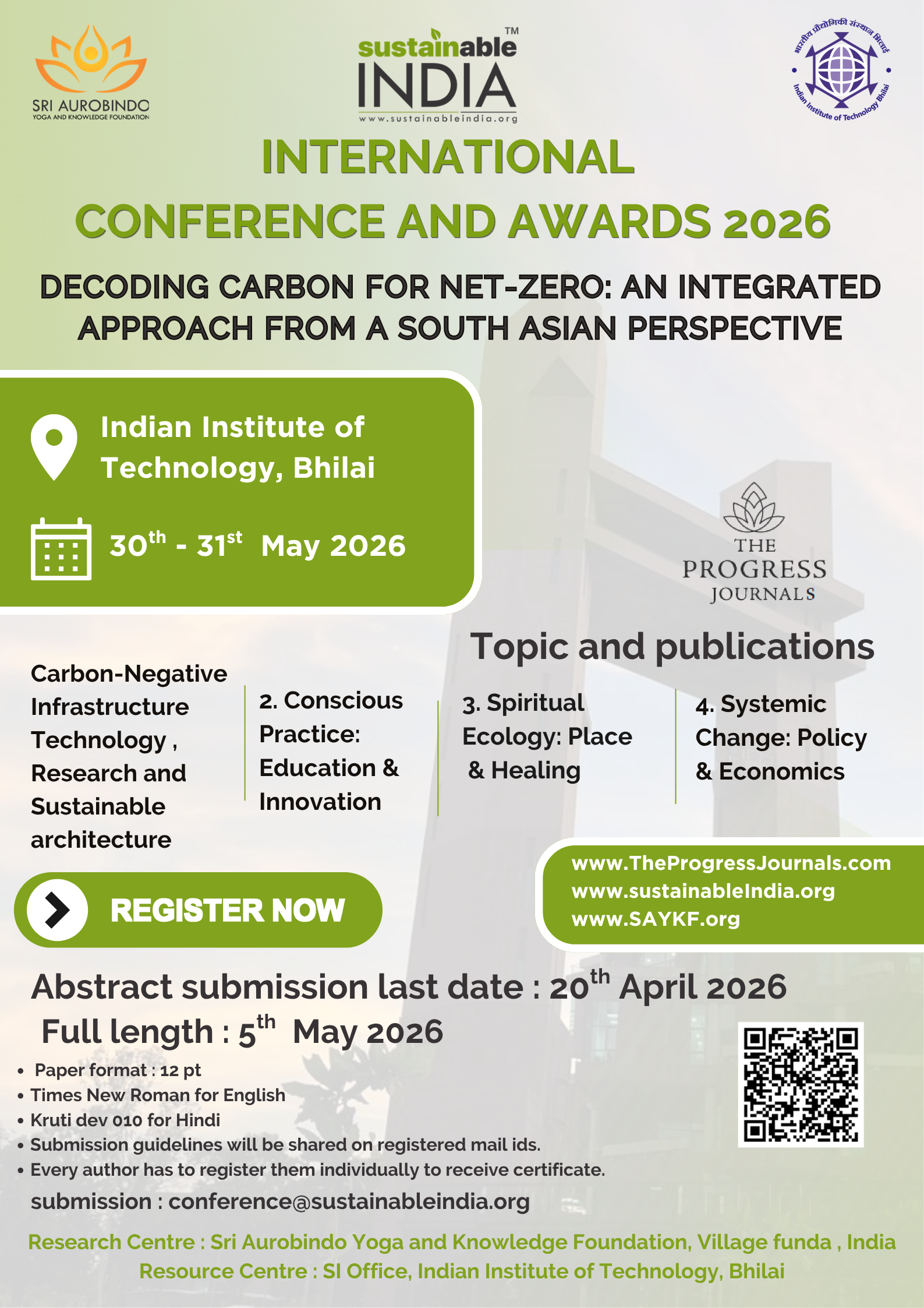 Upcoming Conference DECODING CARBON FOR NET-ZERO: AN INTEGRATED APPROACH FROM A SOUTH ASIAN PERSPECTIVE submission last date : 30th April 2026 on 30th - 31st May 2026 at Venue : Indian Institute of Technology BHILAI 30-05-2026 Submit abstract: conference@sustainableindia.org Apply Now
